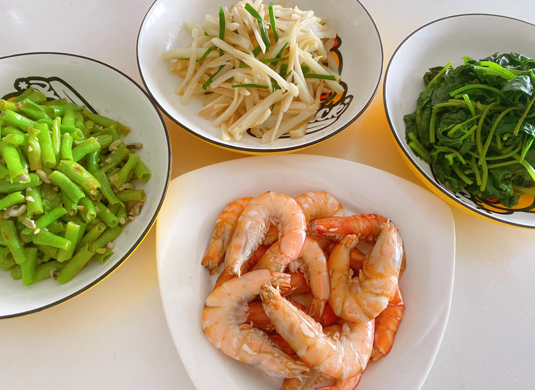 煎饺+蒜蓉油麦菜+虾仁蒸蛋+小凉菜……消耗家里的食材,明天下山赶集……
