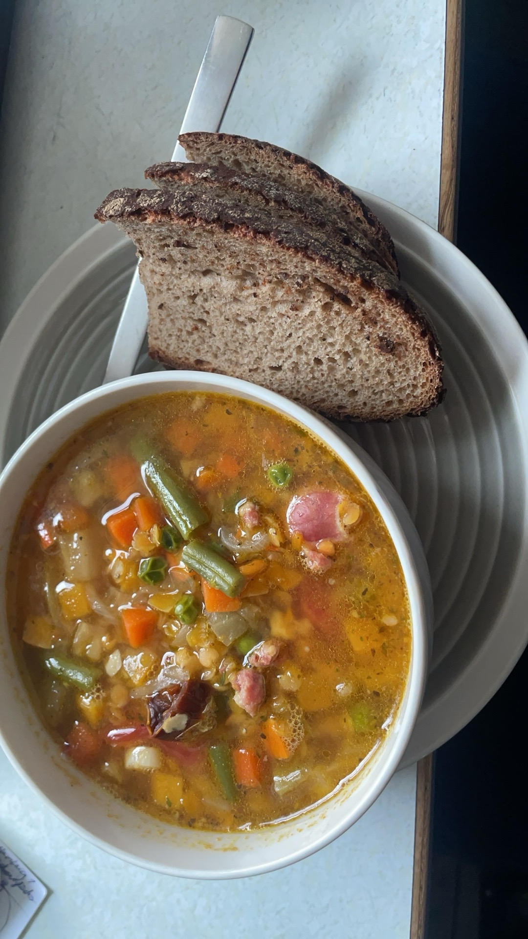 地中海蔬菜汤配黑麦面包,这个地中海蔬菜汤是真的好喝,用的冷冻蔬菜不用切洗方便多了