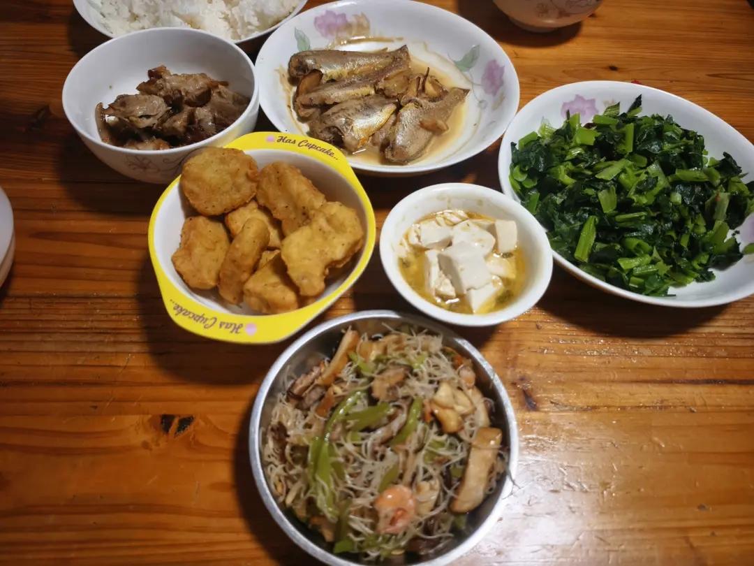 豆腐炖土豆条, 红烧肉,凉拌油豆皮,生吃三文鱼,焦糖三文鱼