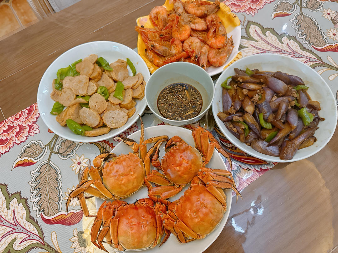 家常菜记录:今吃 清蒸螃蟹 椒盐虾 青椒炒卷章 肉沫茄子