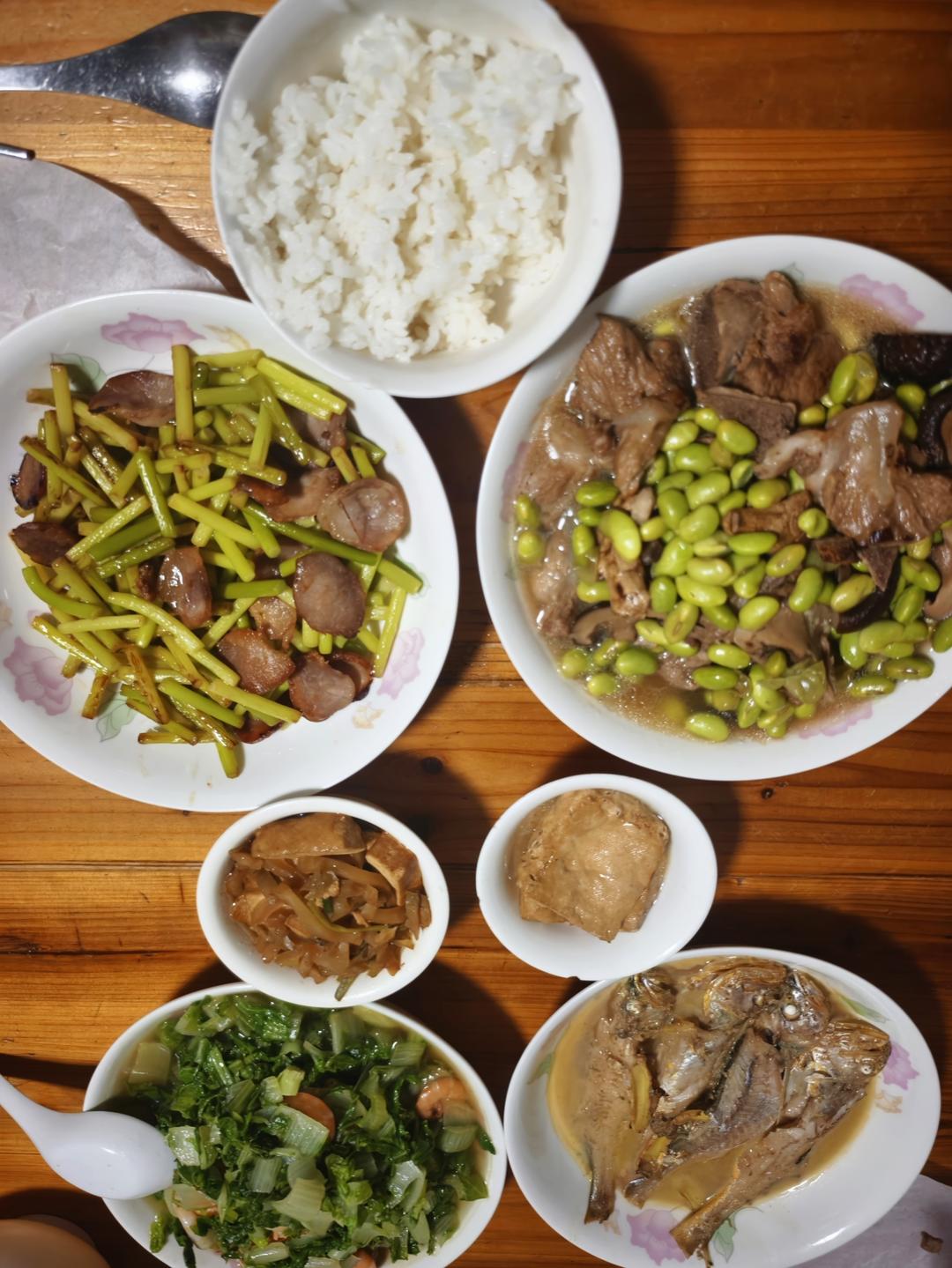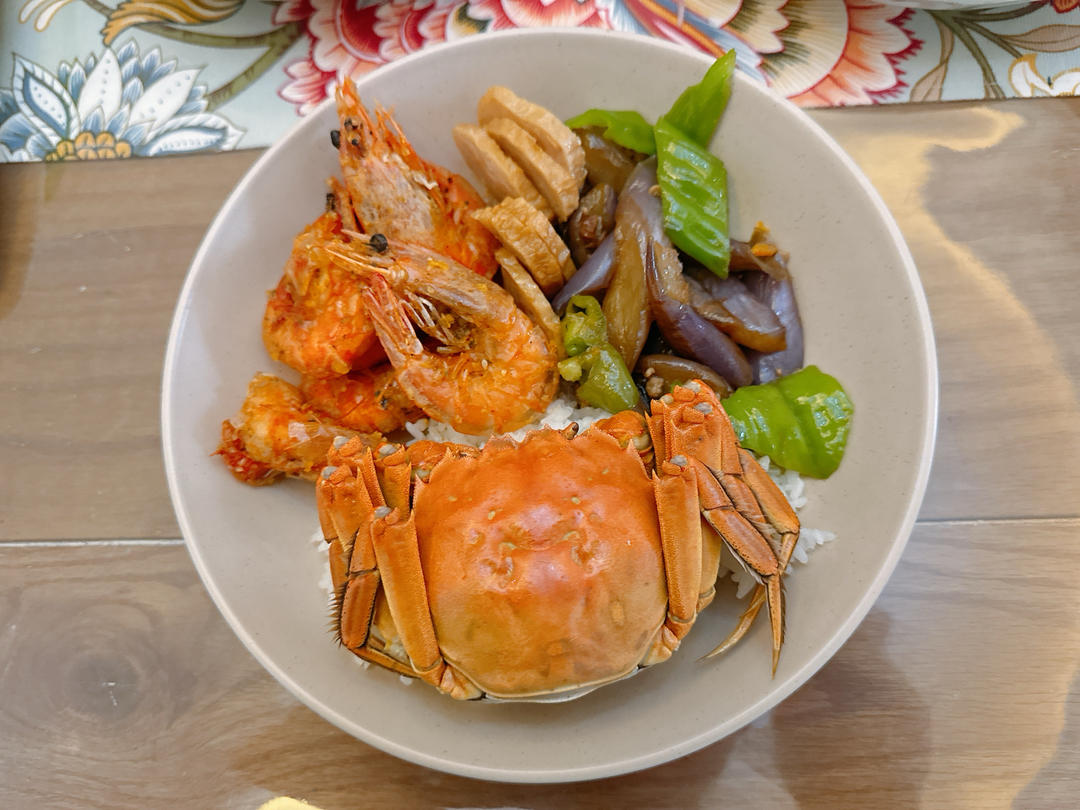 椒盐虾 肉末茄子 炒卷章 清蒸螃蟹 白米饭
