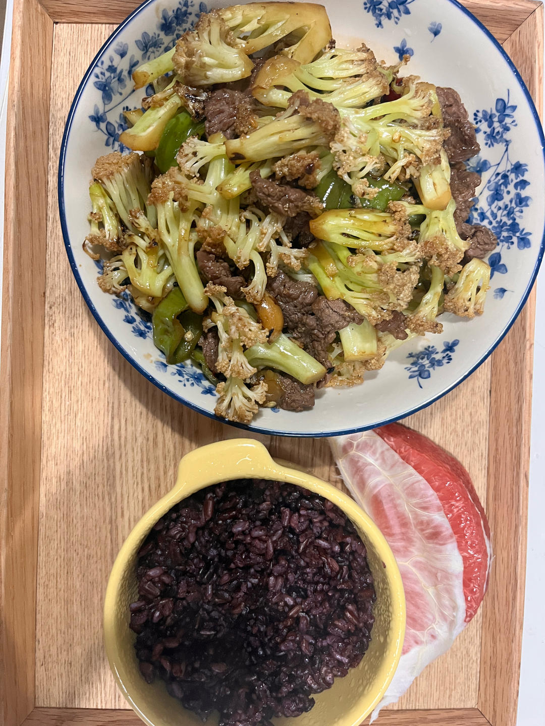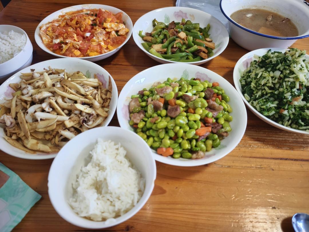 水煮牛肉,娃娃菜炒鸡蛋,米饭😄