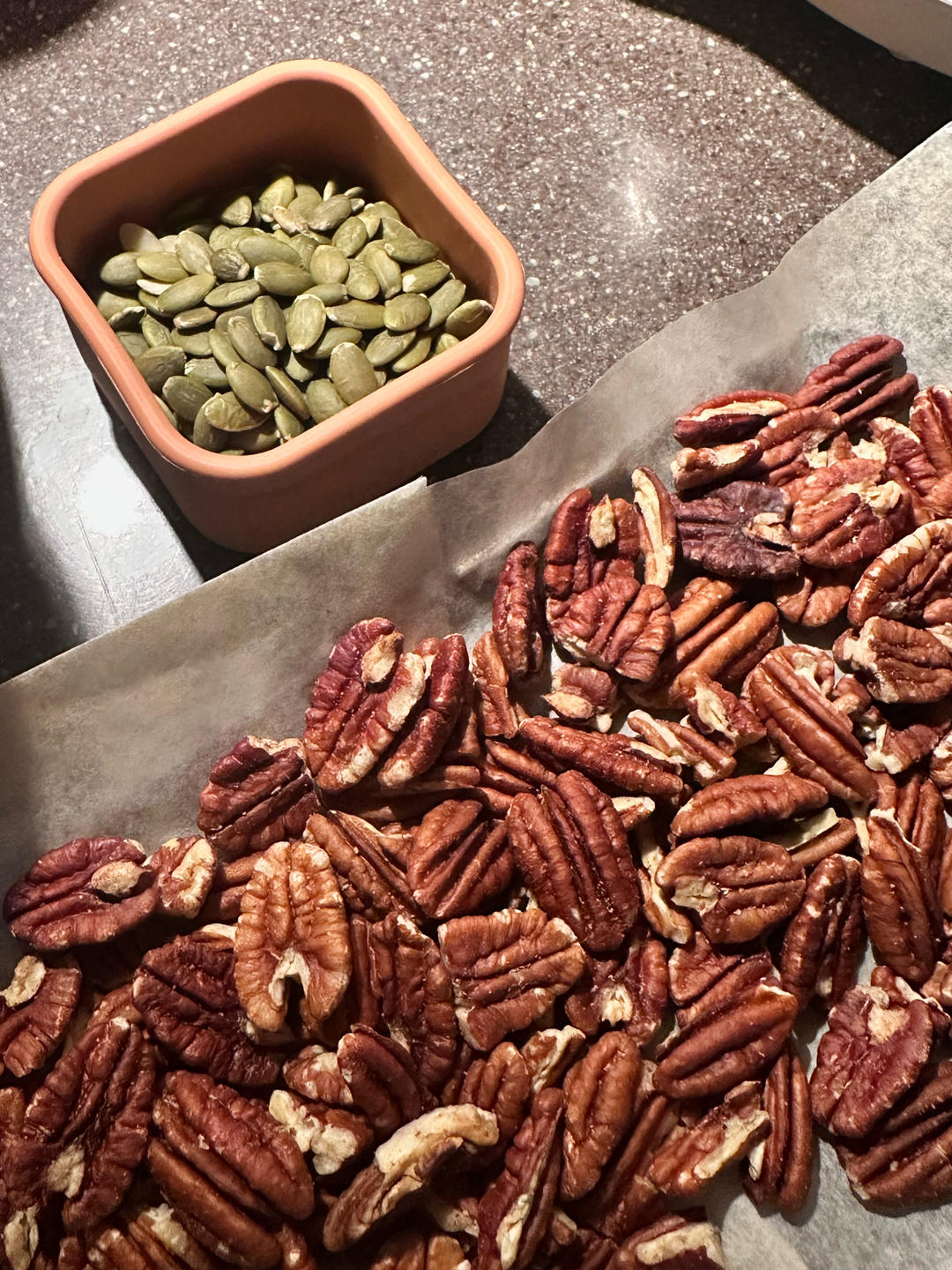 这次配方中的175克果仁选用了150克碧根果、25克南瓜子,味道不错,推荐