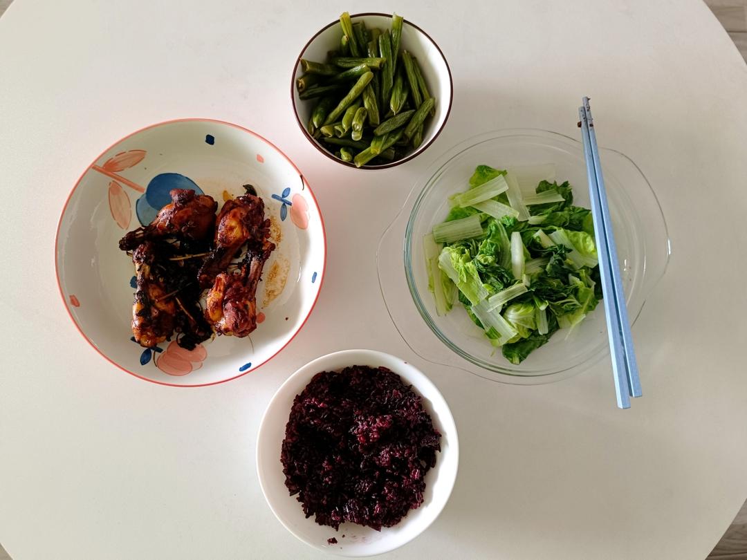 紫苏炖翅根x水油焖四季豆x水油焖杭白菜x黑米饭