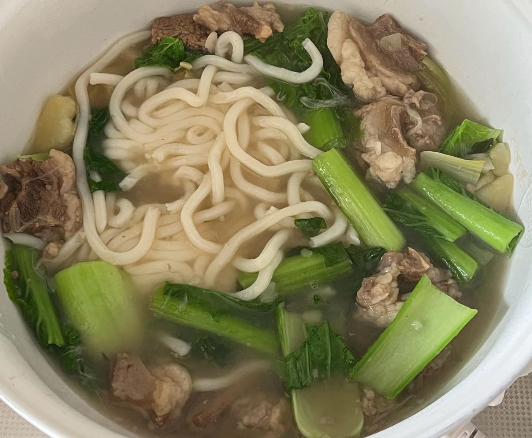 前一天没吃完的清炖牛肋条,放入足够的水重新煮沸,煮点青菜和乌冬面就是完美的一顿工作日简餐。