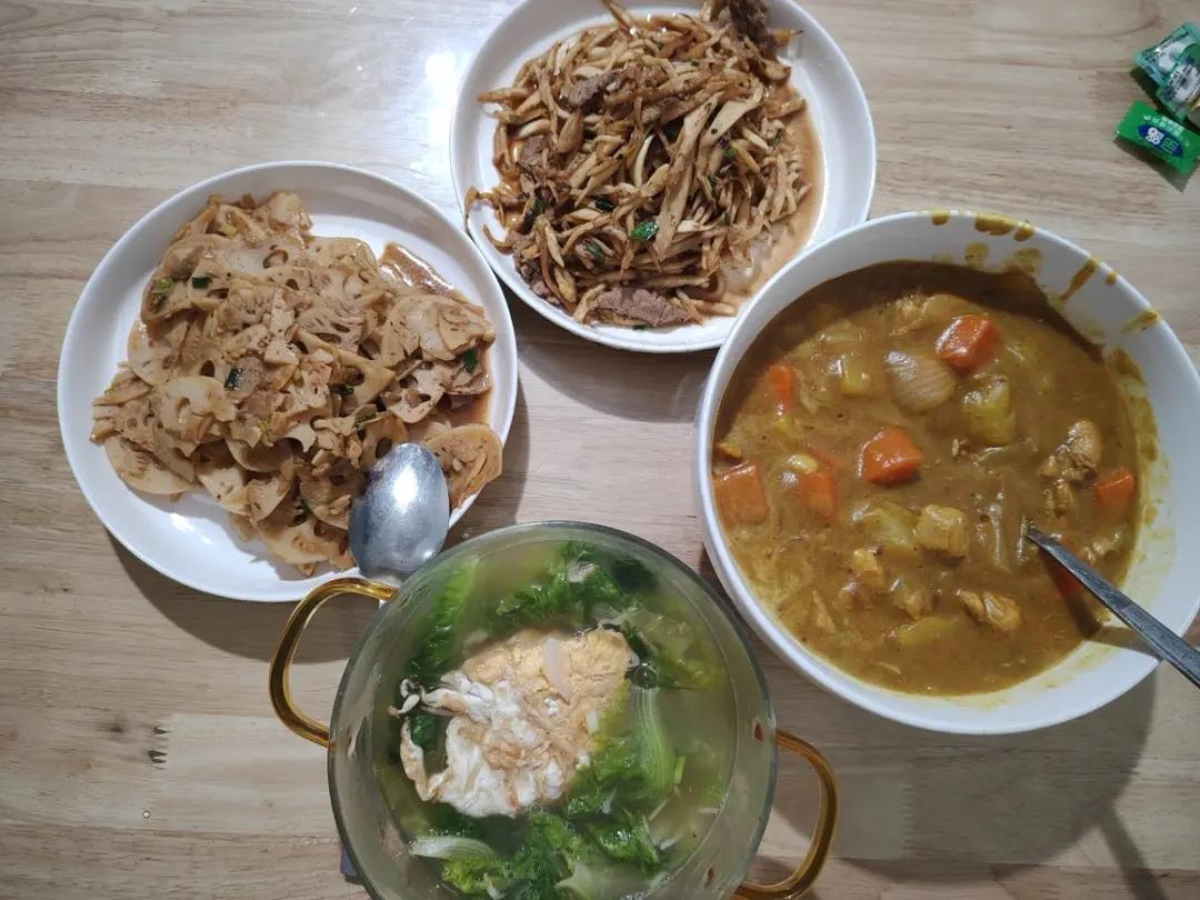 10.25咖喱鸡~糖醋藕片~茭白肉丝~生菜荷包蛋虾米汤!