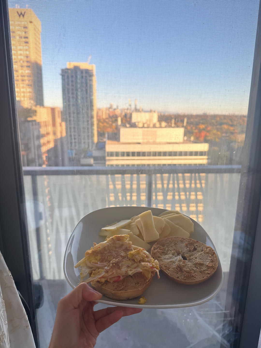 周天早上的蟹柳滑蛋bagel三明治🥪再配上一个苹果🍎,这叫幸福😊