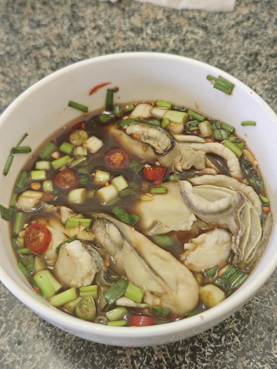这个蘸料真的太鲜了!简单几种调料搞出来这么香…我直接把生蚝倒进去拌着吃。