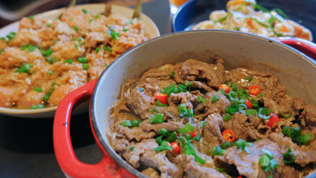 粉蒸肉,芥末虾球,沙茶牛肉粉丝煲,凉拌watercress😋