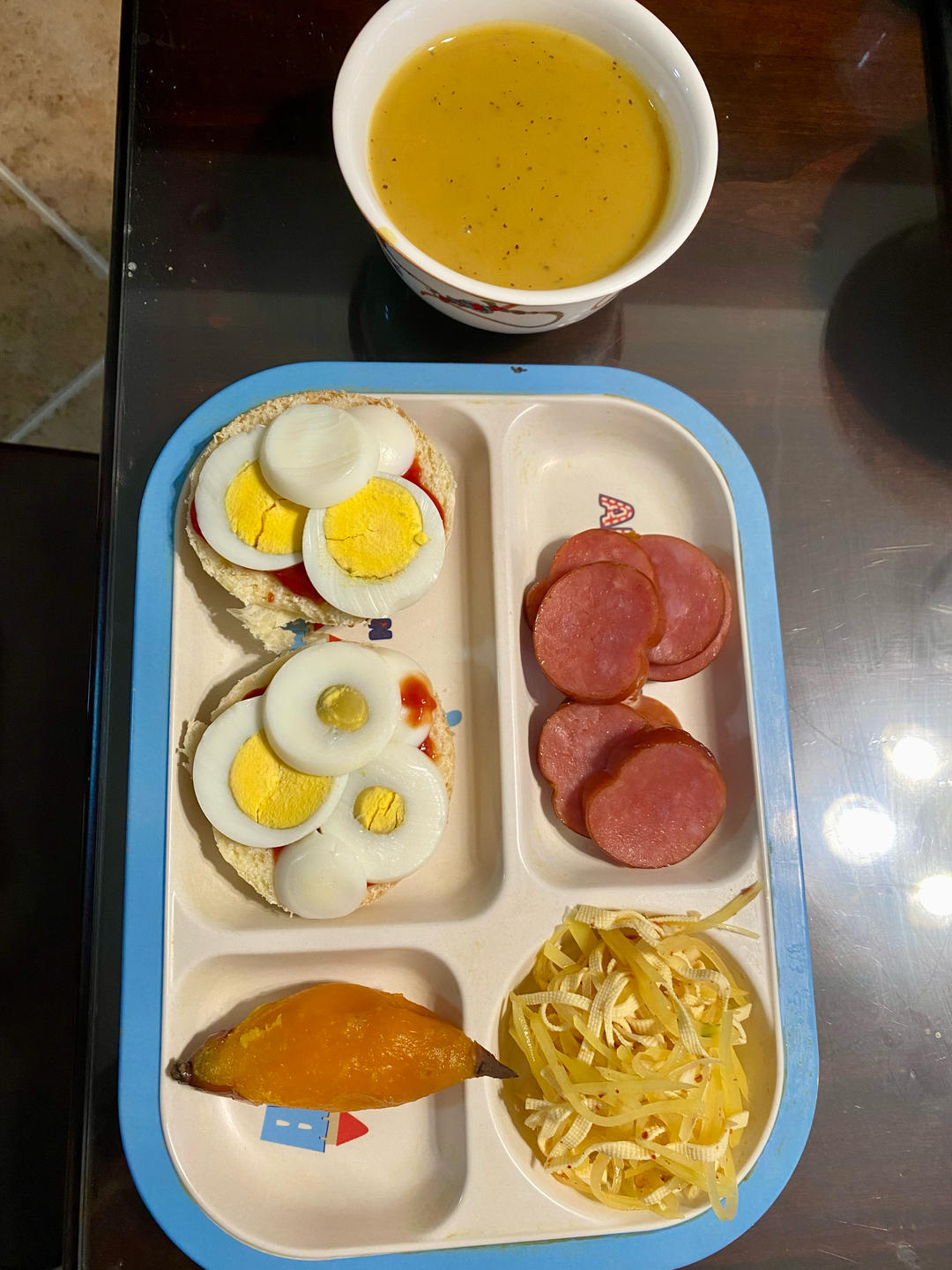 山药红豆饼➕紫菜蛋花汤➕烤肠