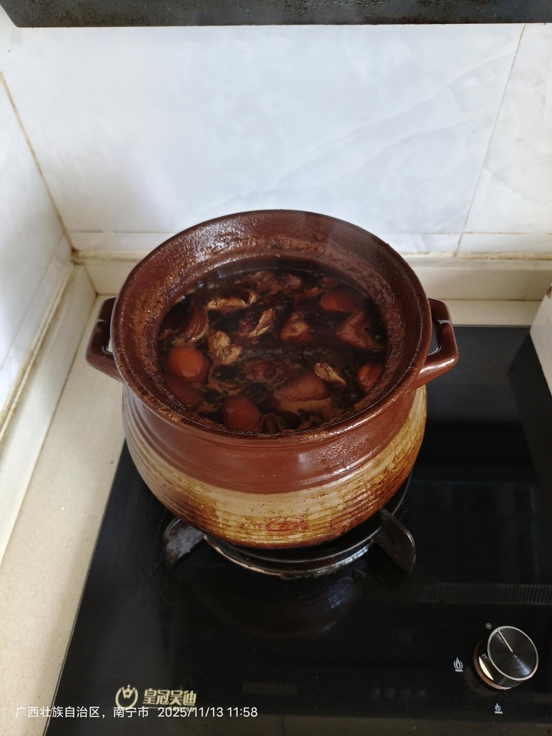 陆川大土猪脚半边差不多满煲了,加了6个鸡蛋,倒了4瓶海天添丁甜醋,才浸过,大火煮开,关小火来不及了,炸锅了,要小小火沸才...