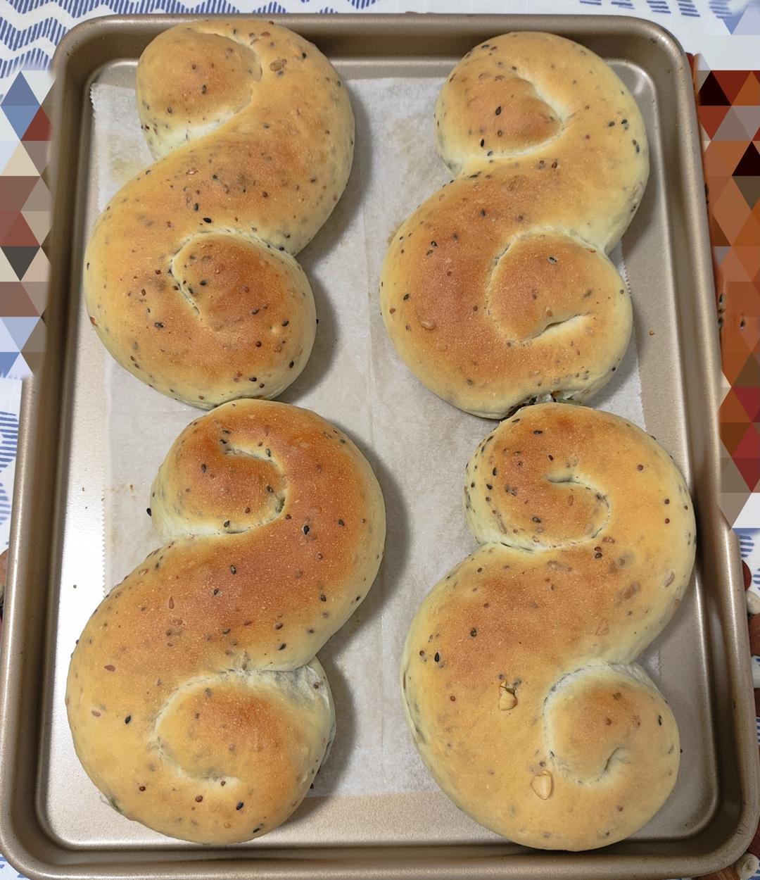 做了黑芝麻奶酪口味的,面包体软乎乎,下次奶酪可以少放点,可能加了芝麻酱有点腻了