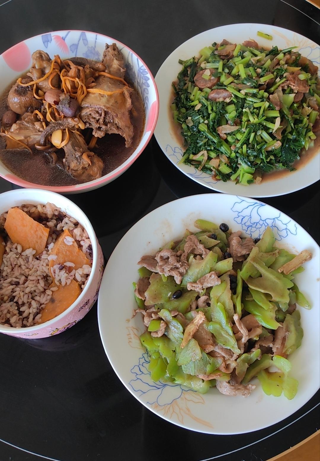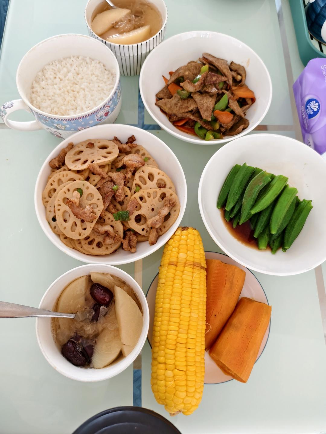 米饭,蒸地瓜玉米,银耳黄桃汤,秋葵,藕片炒肉,猪肝炒青椒