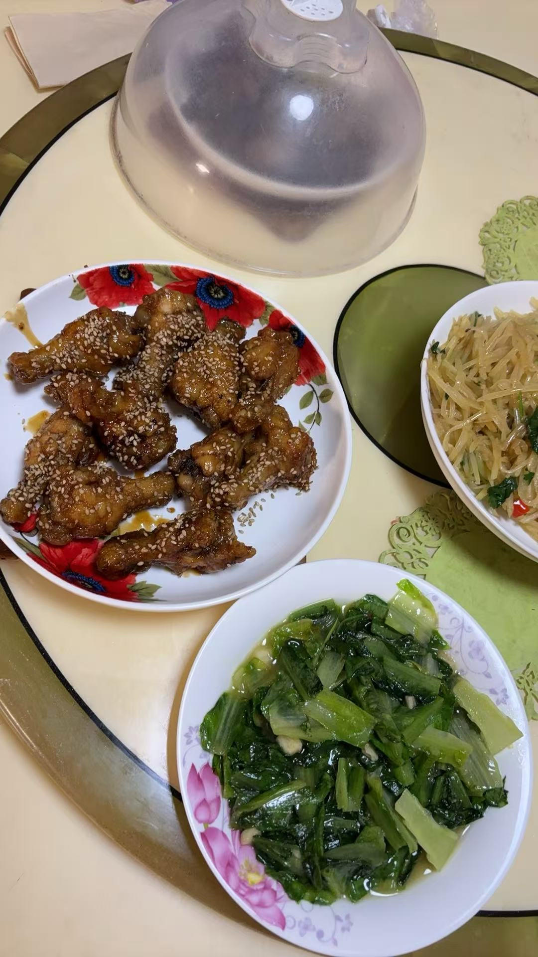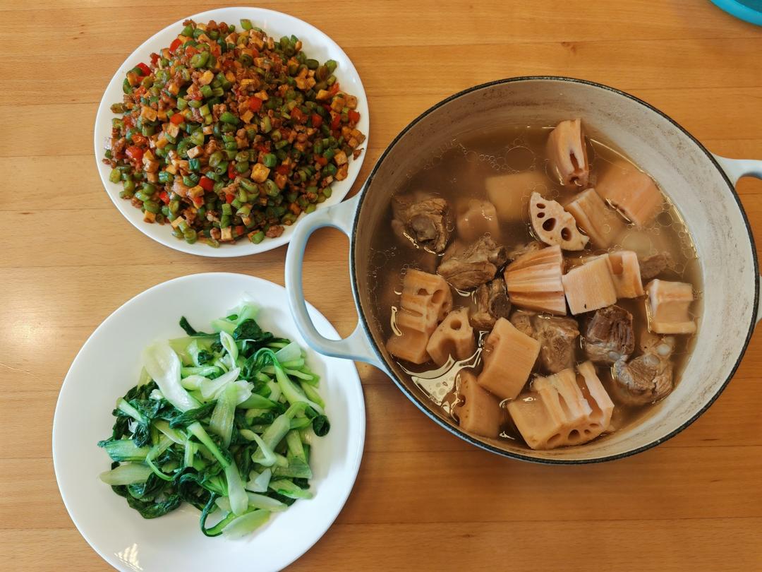 今日午餐:四季豆彩椒豆干杂炒,炒青菜,莲藕排骨汤。