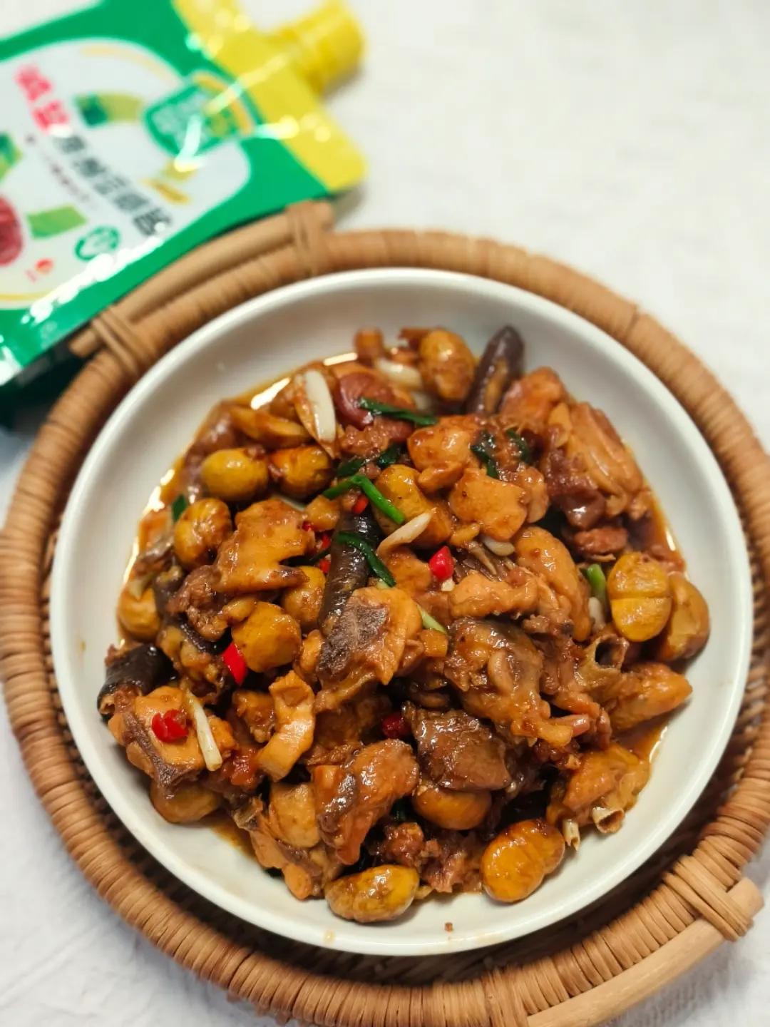 3个鸡腿+200克去壳板栗+2勺葱伴侣豆瓣酱和适量料酒焖煮20分钟左右香喷喷出炉!不用各种七七八八调味料,制作方法真的好...