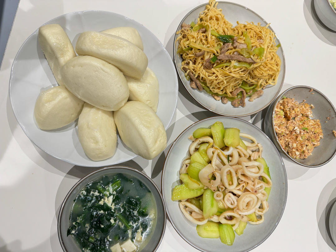 黄瓜炒鱿鱼、尖椒豆皮、炒虾酱