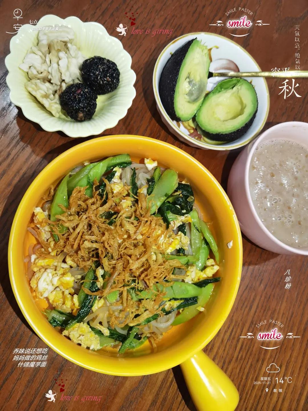 今日份元气早餐~~乔妹还想吃鸡丝什锦魔芋面(莴笋+鸡蛋🥚+...