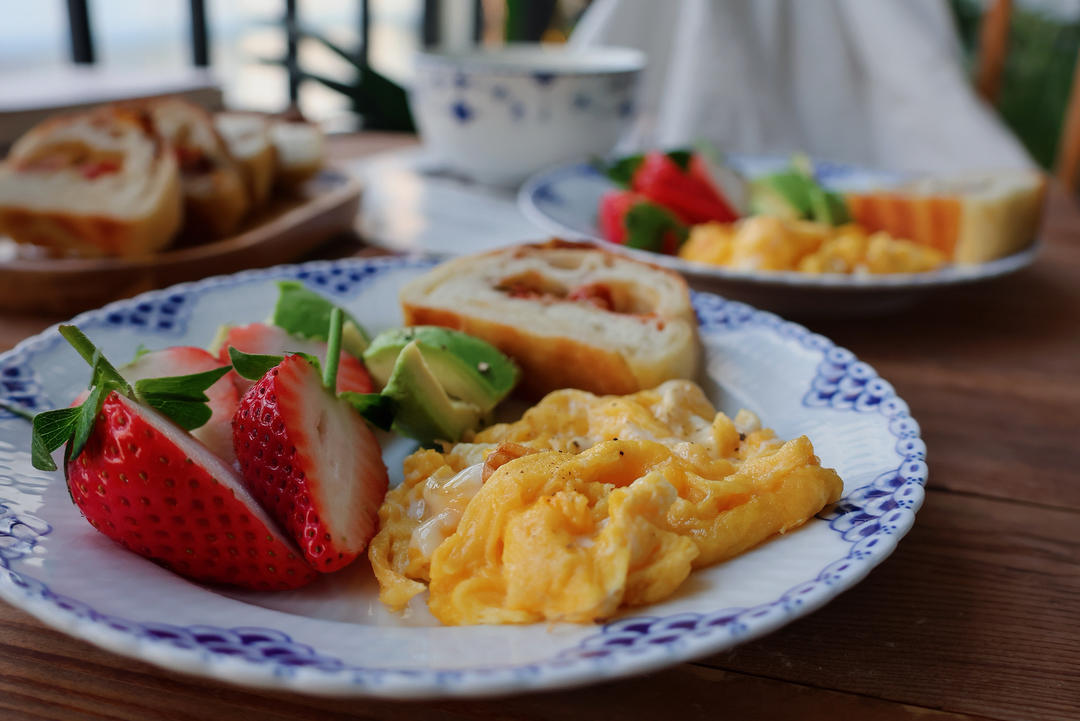 白粥,恰巴塔,滑蛋,牛油果,草莓