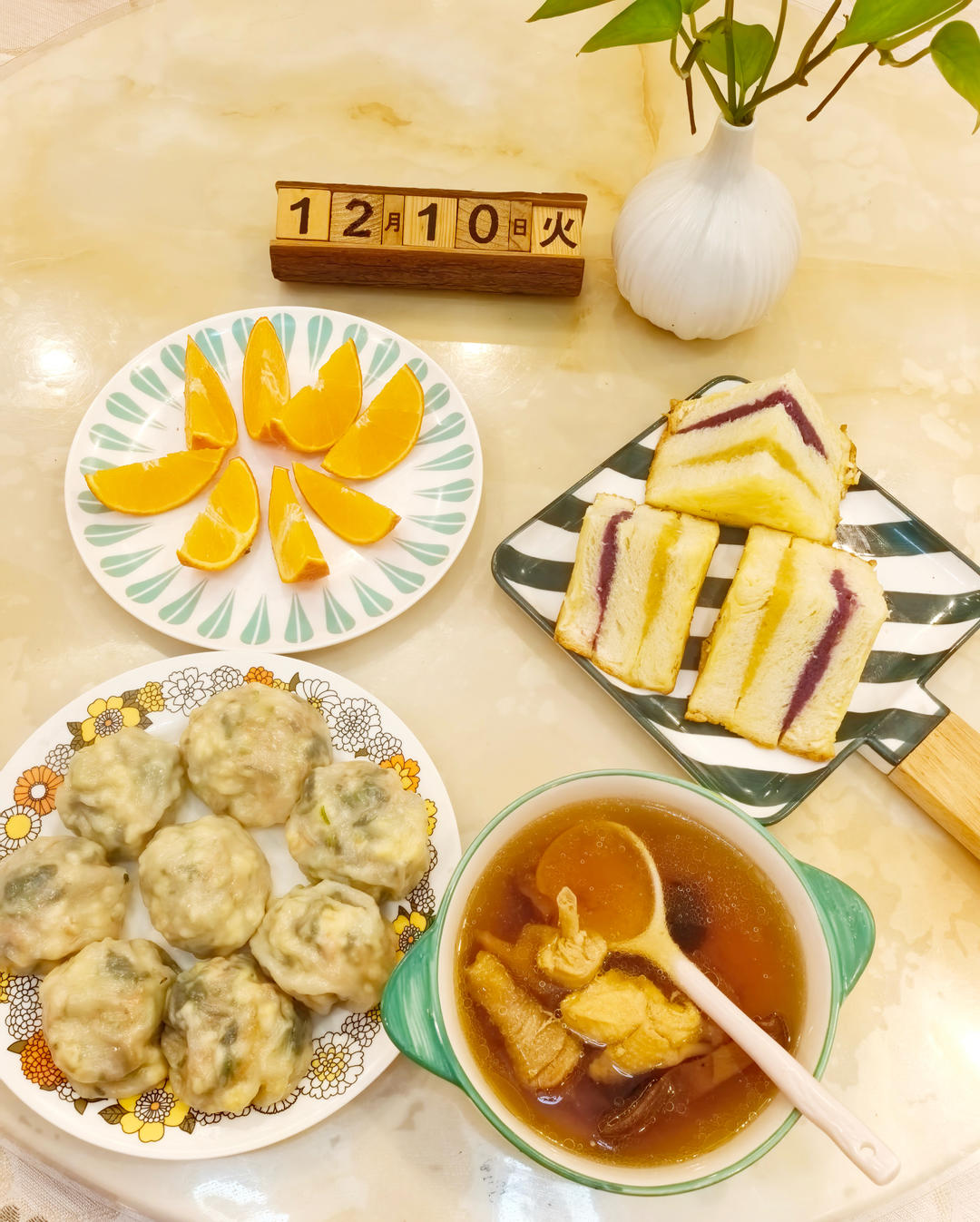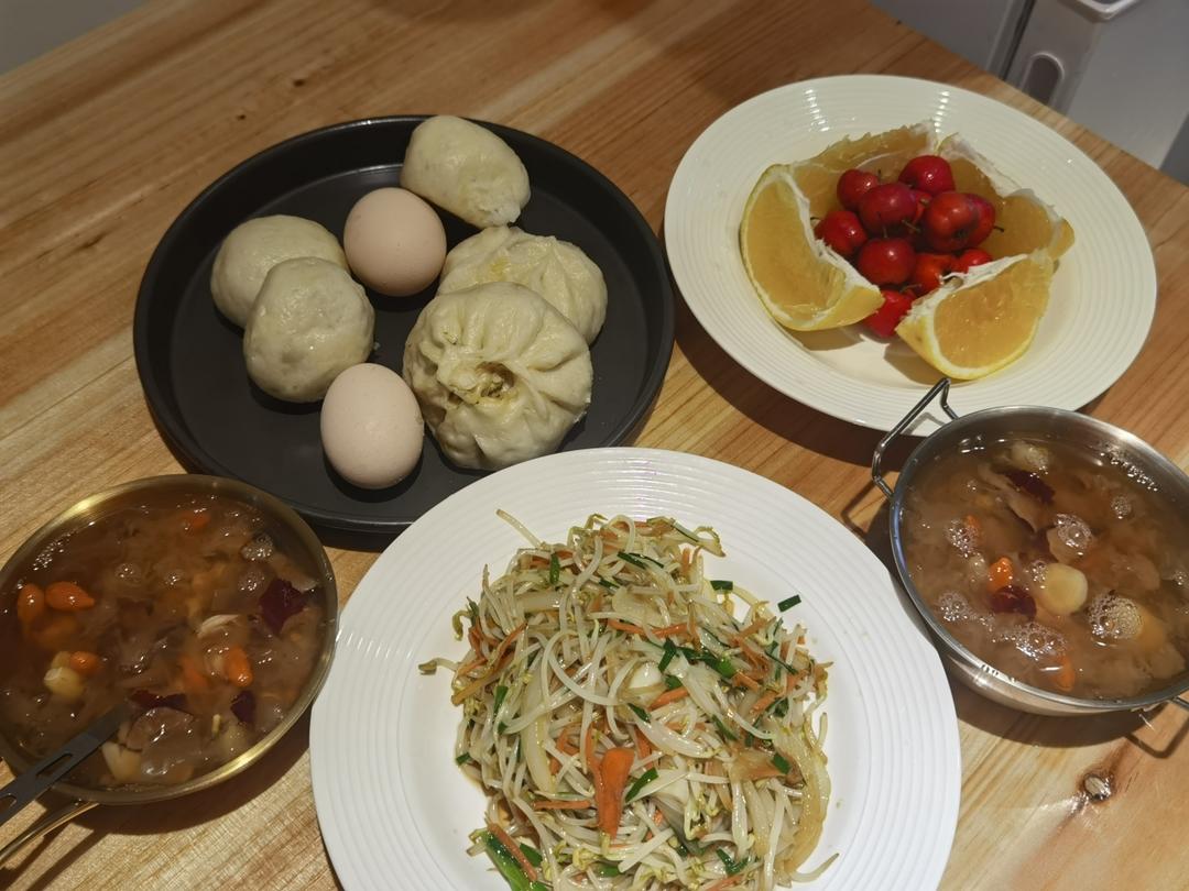 鸡蛋菠菜胡萝卜蔬菜包、双薯三明治、菌菇鸡汤、橙子🍊