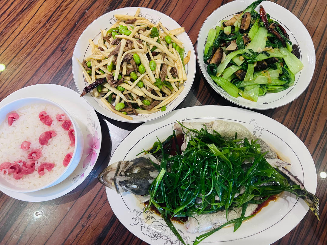 毛豆烧茭白,香菇油菜,清蒸桂鱼,米饭。