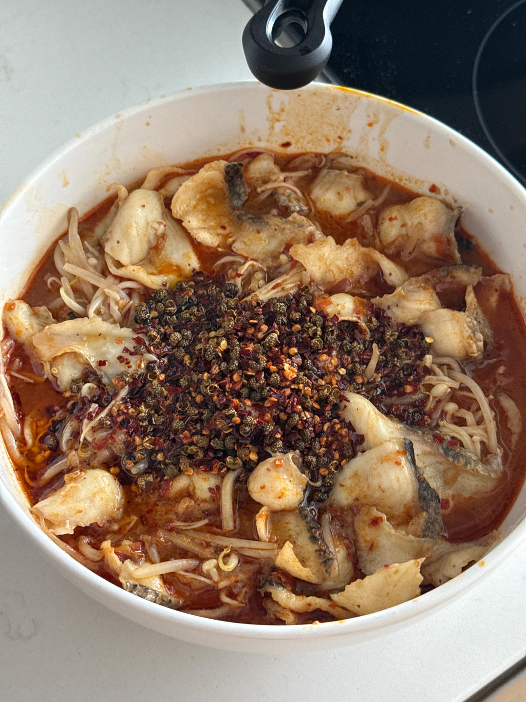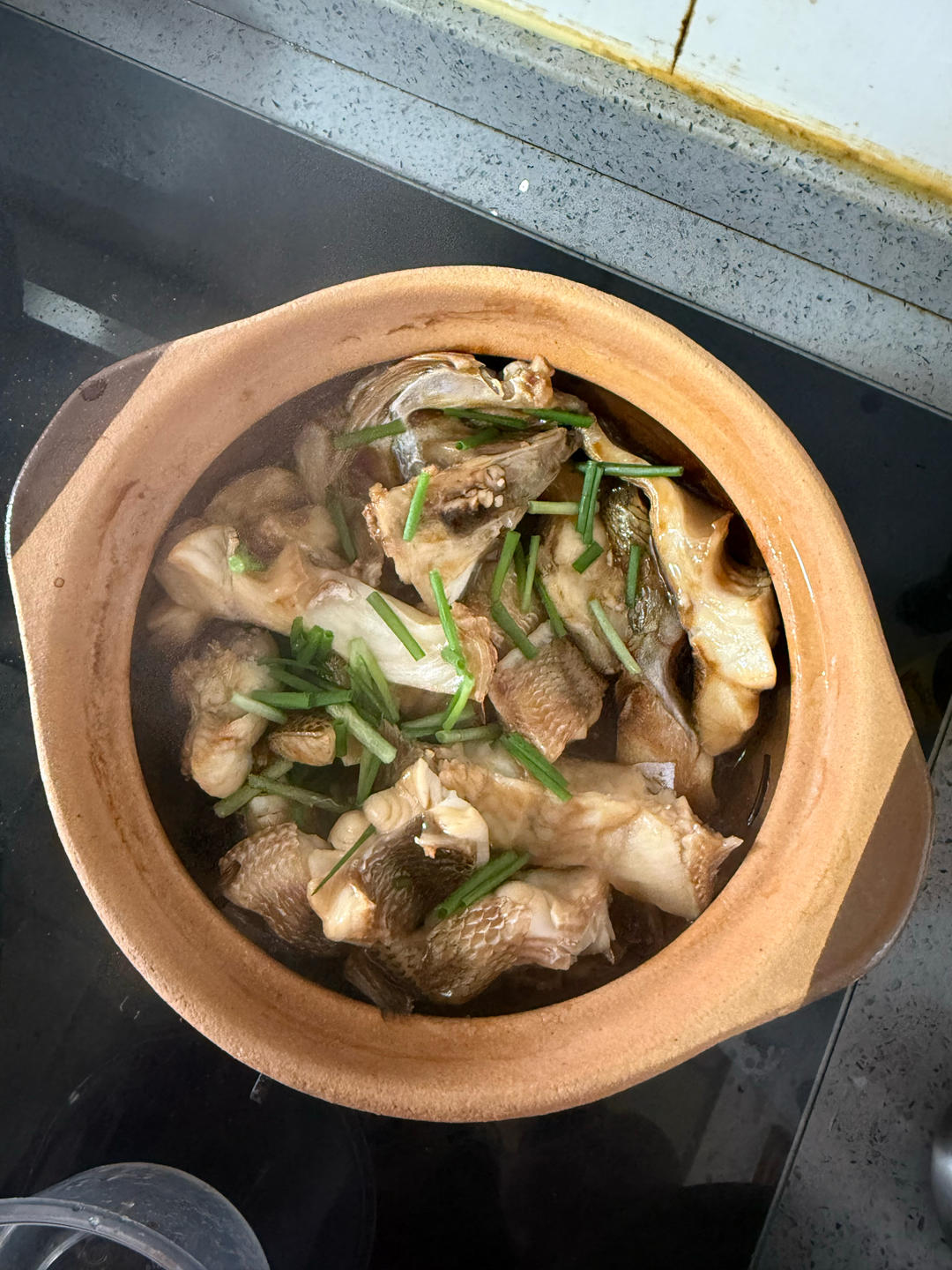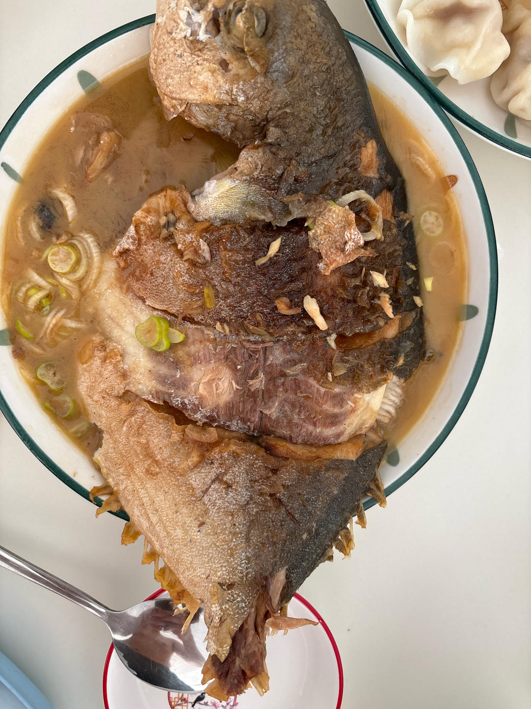 锅里热油冒烟➕盐,煎的时候没有粘锅破皮。炒完葱姜蒜,加料加开水,炖了二十分钟,味道不错。