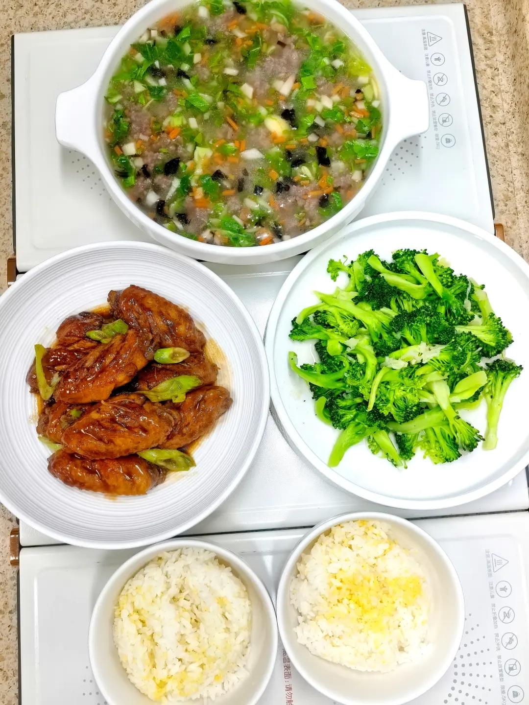可乐鸡翅,蒜泥西兰花,牛肉沫蔬菜羹,大米小米饭