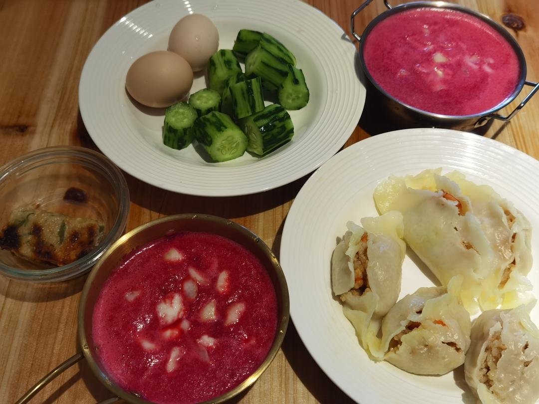 拌紫甘蓝,西兰花🥦,鸡蛋🥚,茴香包子,小米粥忘记拍照📷啦。