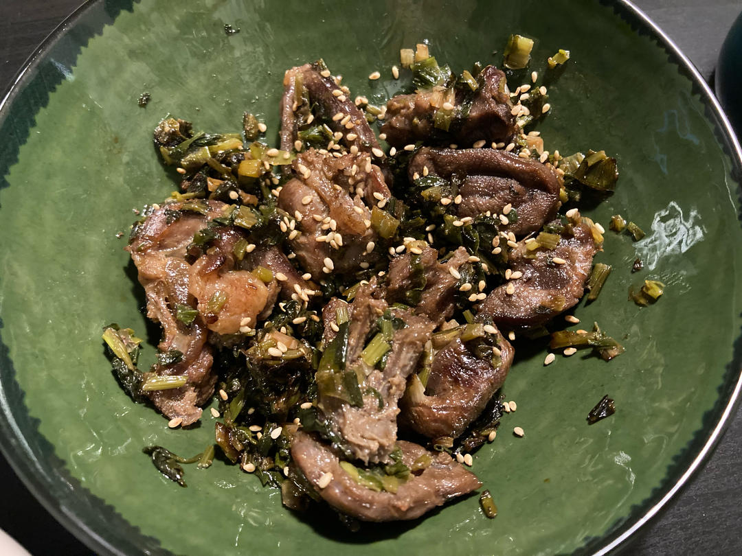 盐葱酱牛腿肉。牛腿肉片切得有点厚加有筋不太容易熟,就煎后调小火力盖盖焖一段时间,效果可以的~