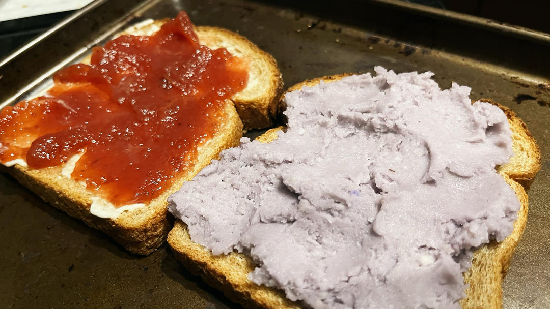 芋泥+草莓果酱+薄薄一层brie spread三明治,是哪个小天才发明的神仙组合😋这种快碳太适合练后了~