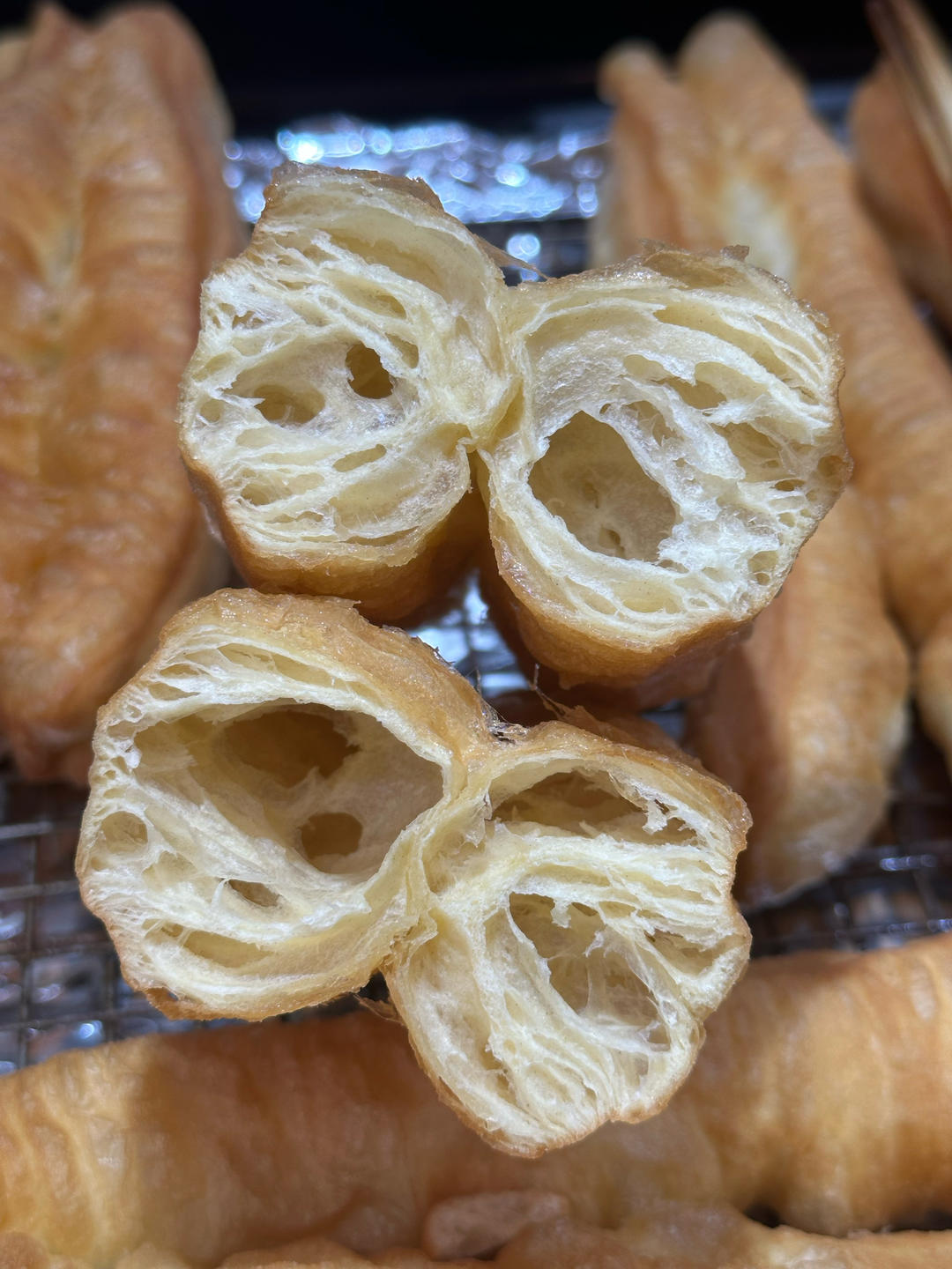 村驴版油条,中间容易散开,要画水线,用筷子压,两头手指沾水捏紧,放置两分钟再炸。感觉有点...