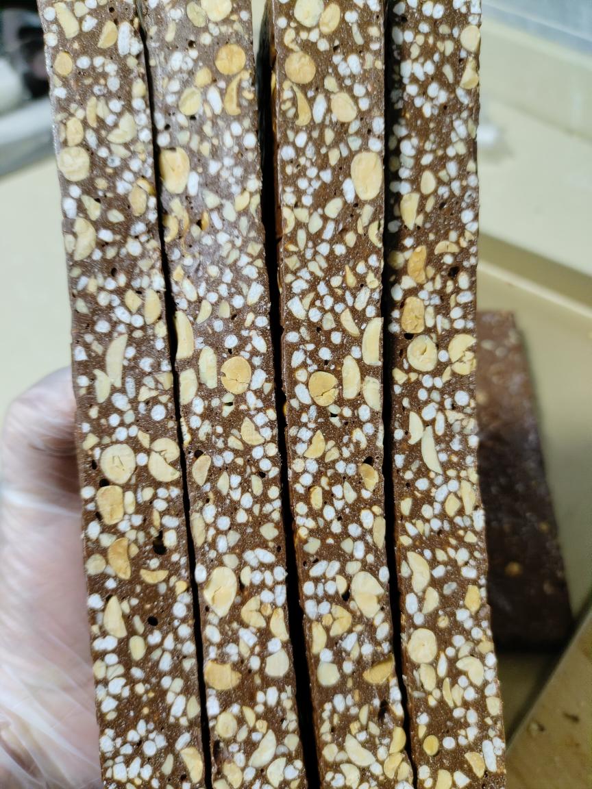 成功的熬糖版牛轧糖一定是自带气孔的,巧克力牛轧,加了N多纯可可脂和可可粉,香浓醇厚,奶香加巧克力的醇厚,还有巧克力的绝配...
