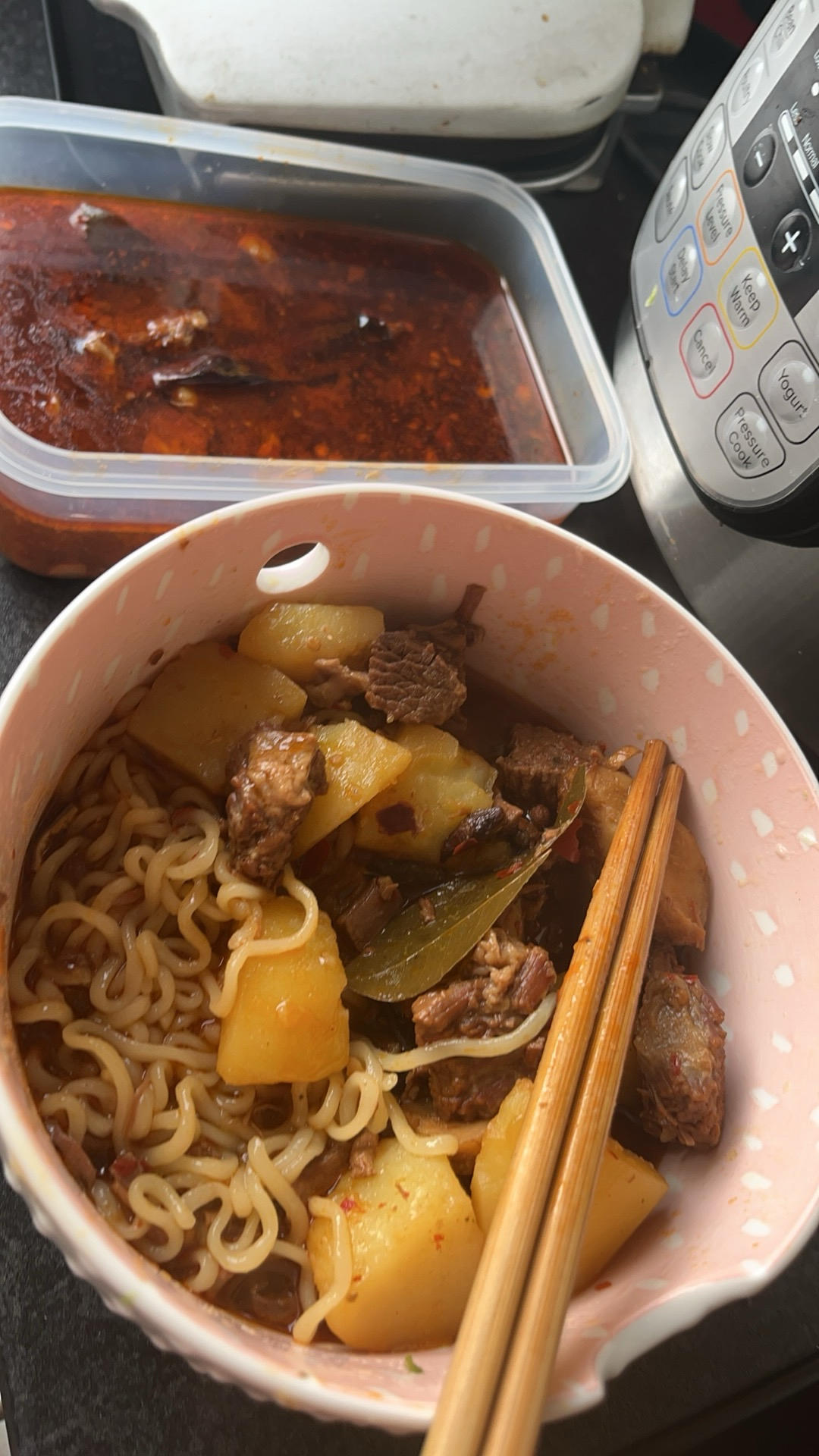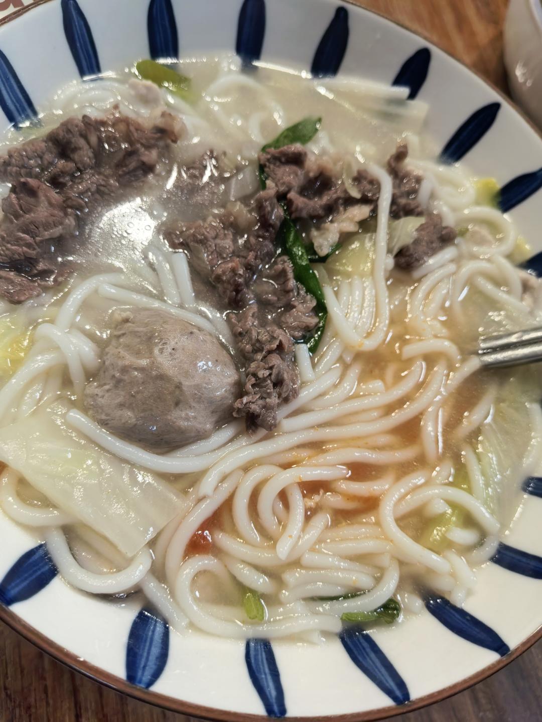 吃牛肉面,自己做的红烧牛肉,但是部位没选对,想要那种软软糯糯的口感,结果略柴了呜呜呜😭