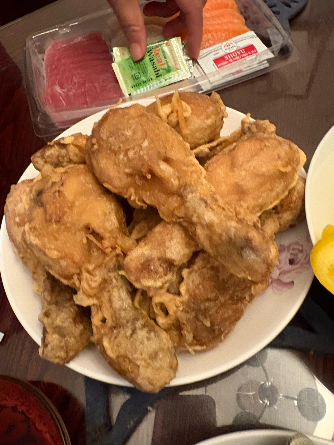 昨天的晚饭:香酥鸡腿,Costco买的刺身拼盘,白蛤,生菜甜椒,韩国泡菜