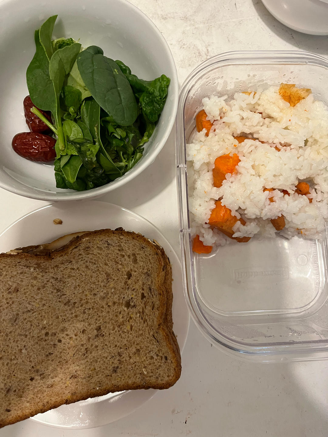 周六早饭-鸡肉炒辣椒和面包;周六晚饭-西红柿鸡蛋豆腐面。