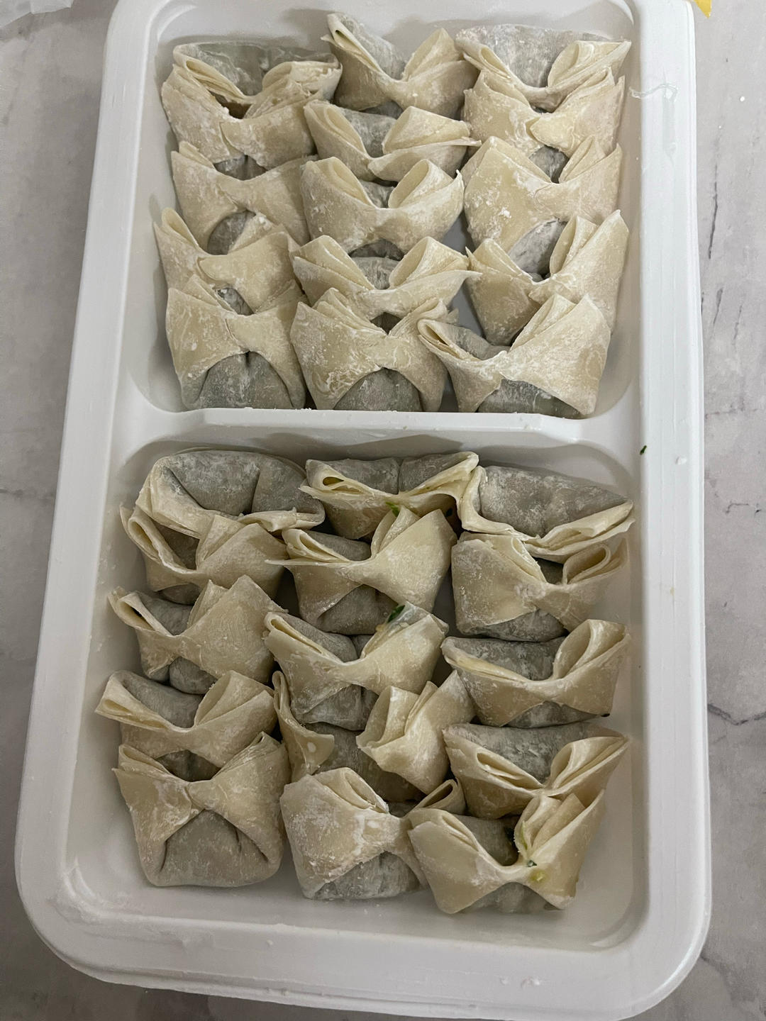 青菜猪肉馅小馄饨,为早饭提前备餐。包了2大碗馅儿,200多个,冻起来慢慢吃。