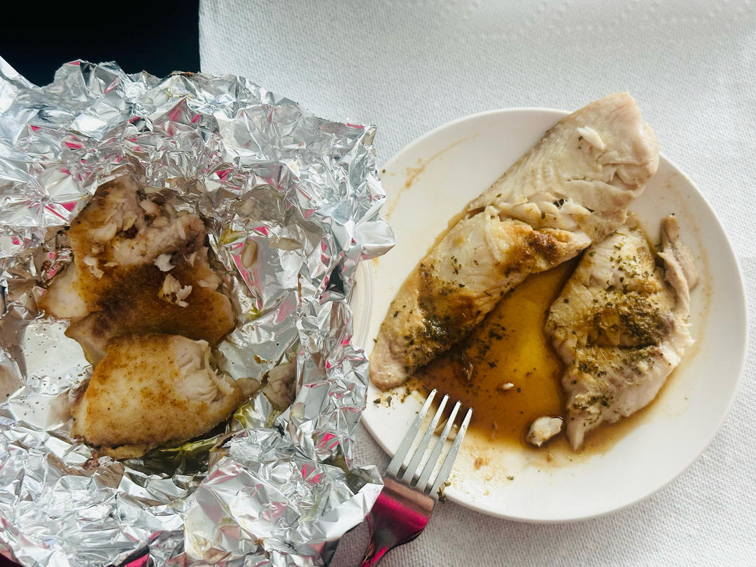 一鱼两吃!清蒸+空气炸锅烤。烤的香一点,刷了蒜粉、盐、辣椒粉、橄榄油,但是蒸的完全没有腥味...