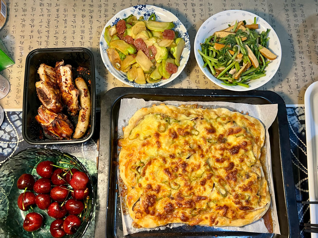 节日四人晚餐出自我手~披萨饼底不够薄脆,看来应该先单独烤一下再铺料。满满几层口蘑+三文鱼+洋葱+青椒堆叠,...