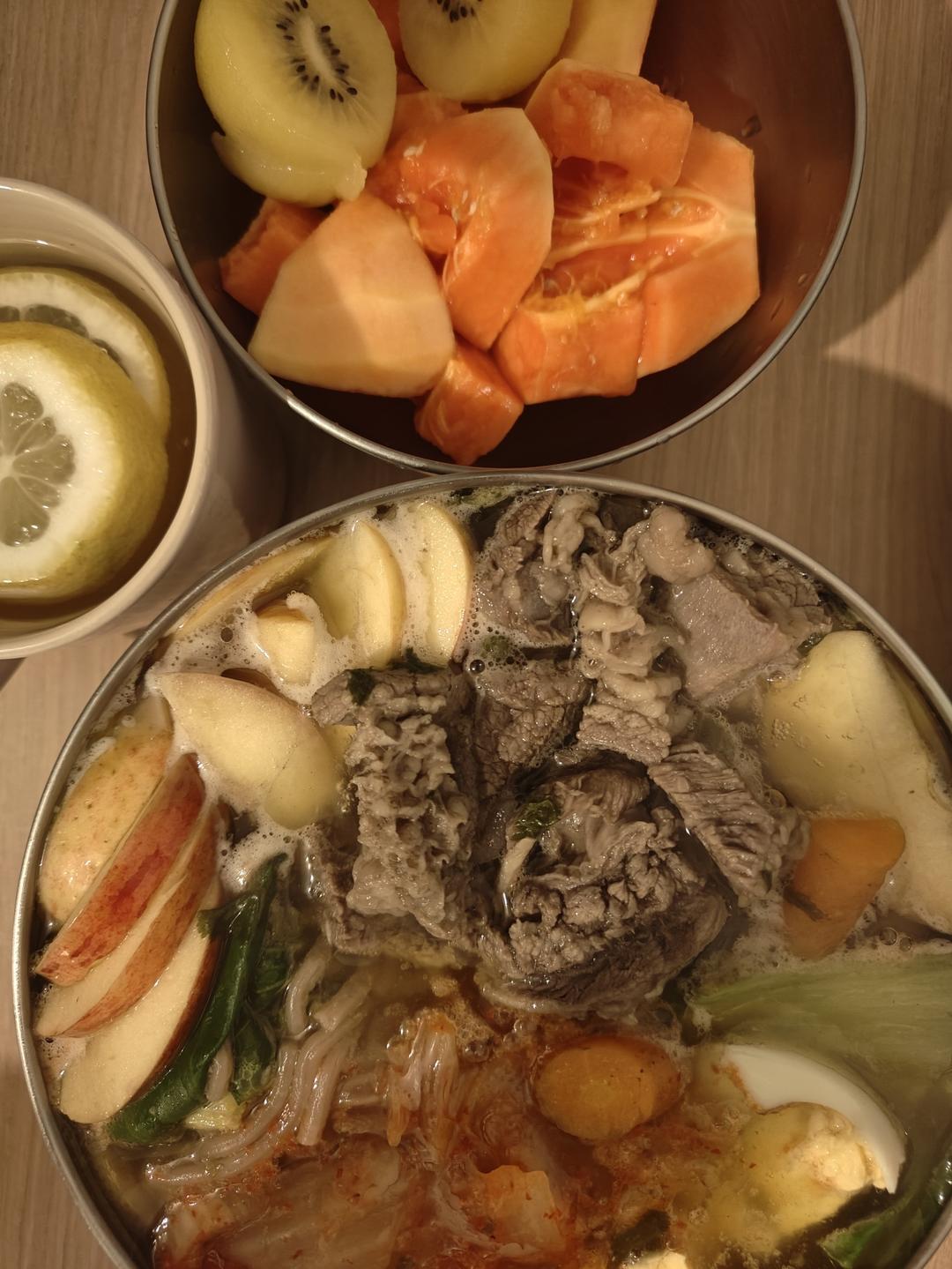 巴斯克醋香醋甜酱油苏打水柠檬片小柿子辣白菜鸡蛋胡萝卜牛肉油菜荞麦冷面(牛肉汤:草果大料酱...