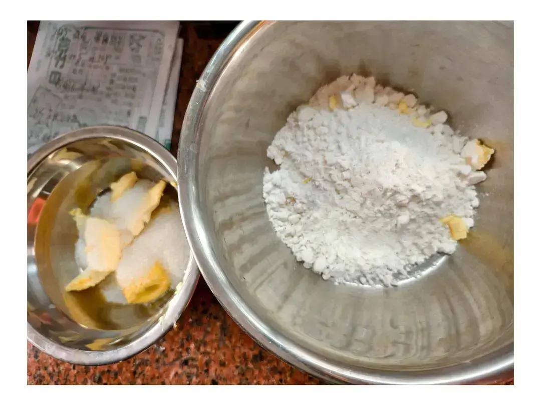 苹果塔过甜,调整配方后。 150g低筋面粉,50g黄油,20g糖,揉搓成细...