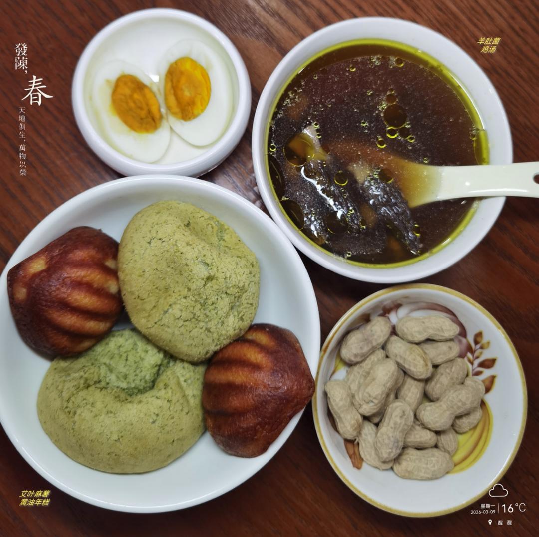 今日份元气早餐补录:羊肚菌鸡汤+艾叶麻薯+黄油年糕+花生🥜+鸡蛋🥚