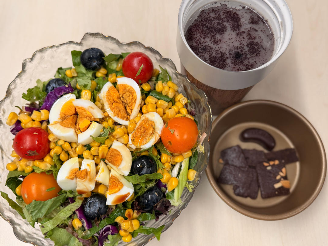 鸡蛋玉米色拉+巴西莓粉黑豆豆浆+黑巧脆片