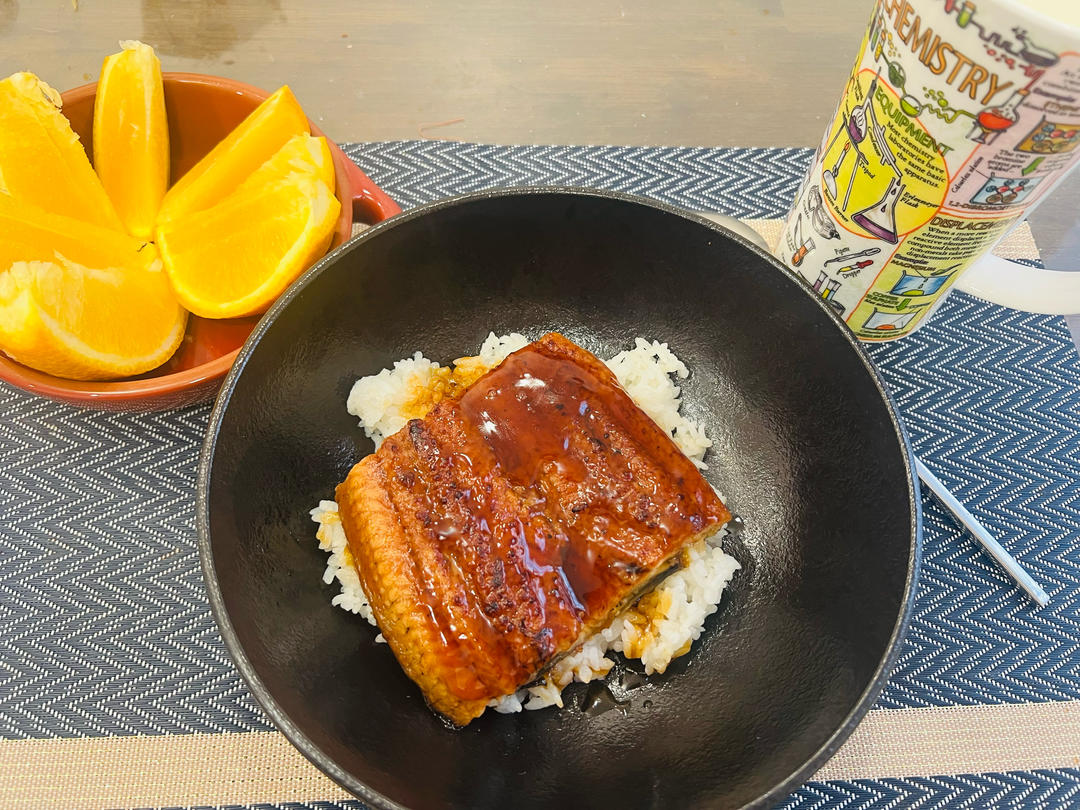 鳗鱼饭;午餐:番茄炒蛋;晚餐:生菜蘸酱,北极甜虾。