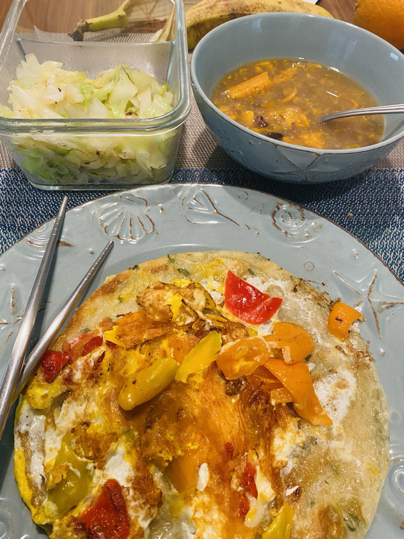 黑豆红豆红薯粥,包菜丝, 葱油鸡蛋饼配cheese和小甜椒