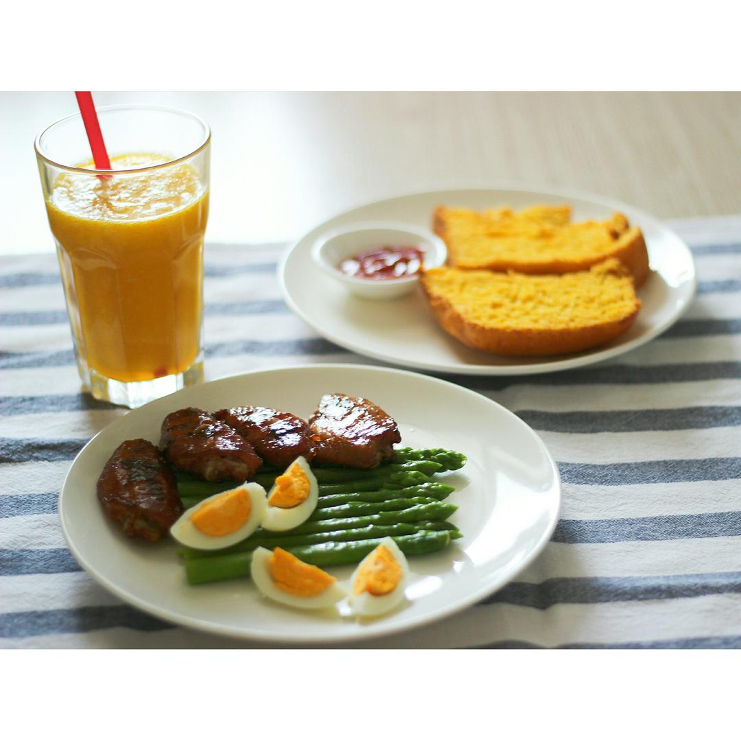 今日早餐:鸡蛋鸡翅芦笋+面包+芒果汁