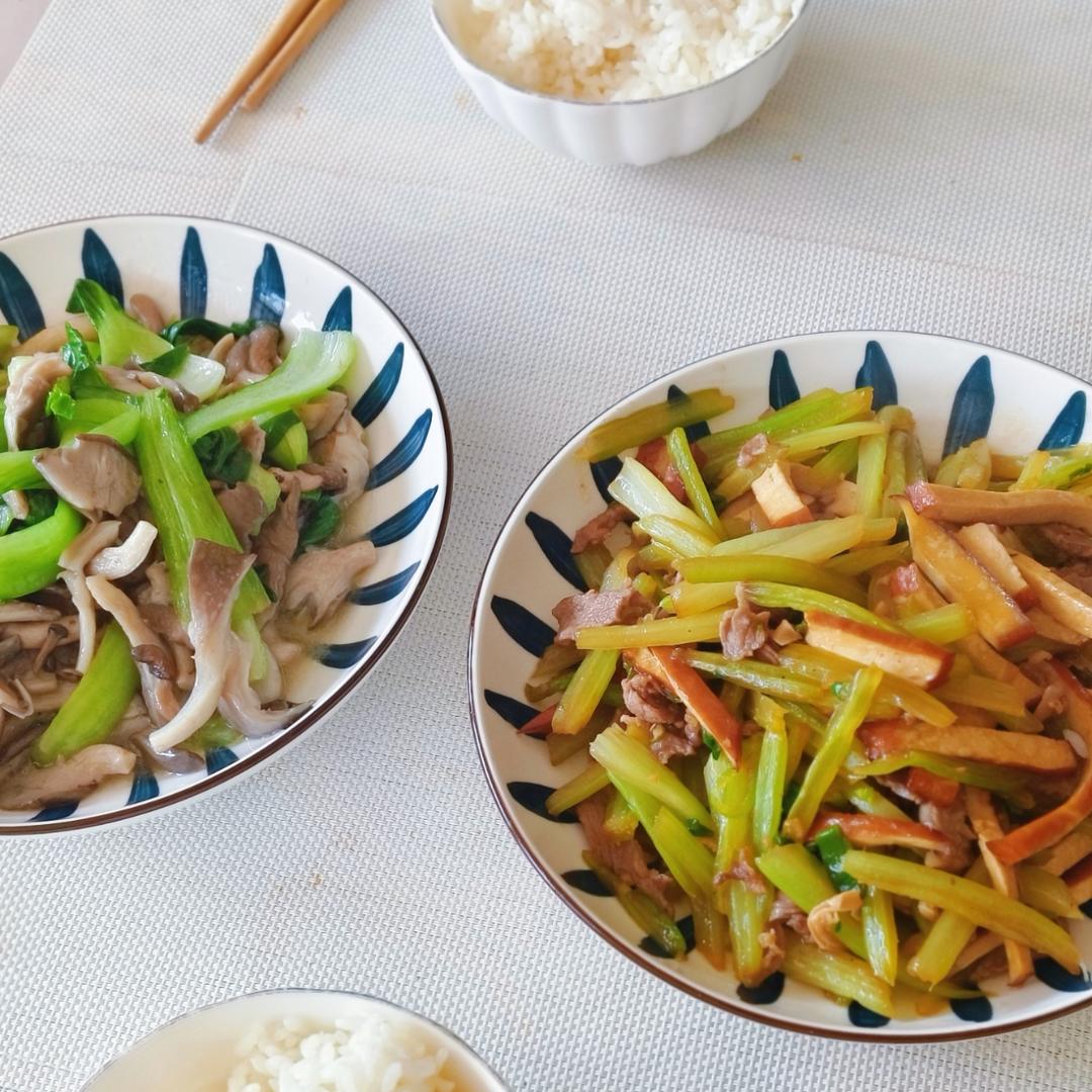 秀珍菇炒油菜、熏干炒芹菜