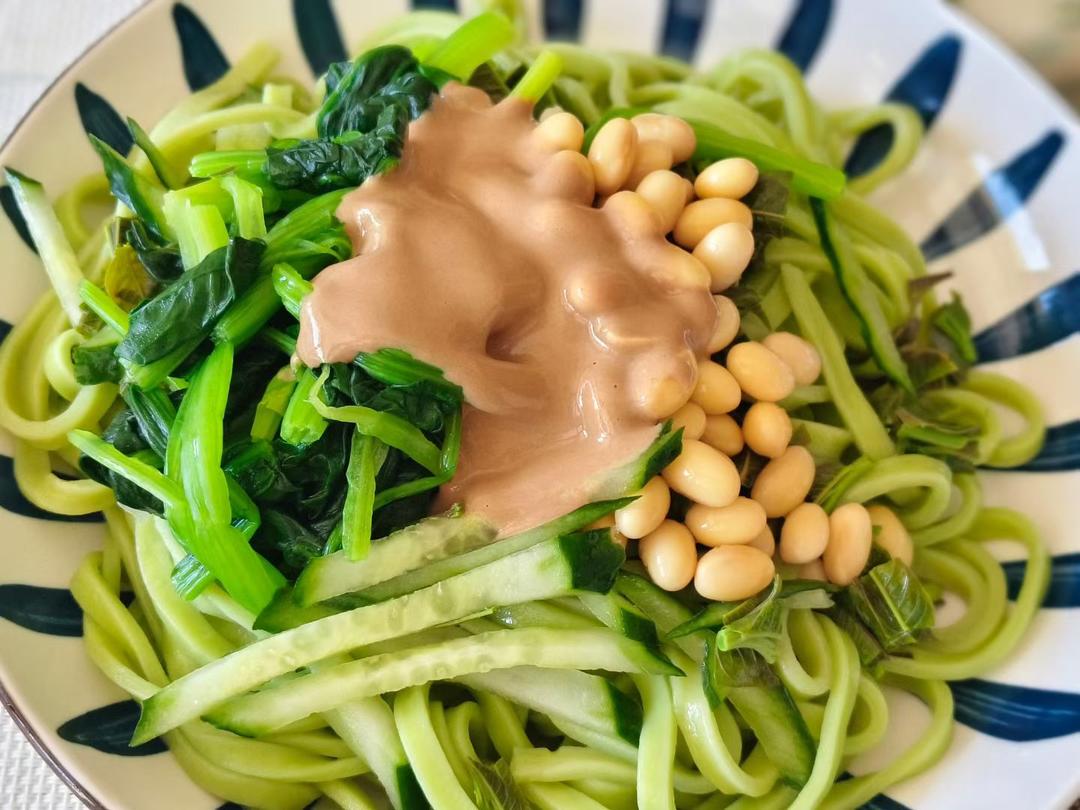 头茬儿香椿、新鲜的菠菜、绿色菠菜面条,做了今春第一盘芝麻酱凉面🍜