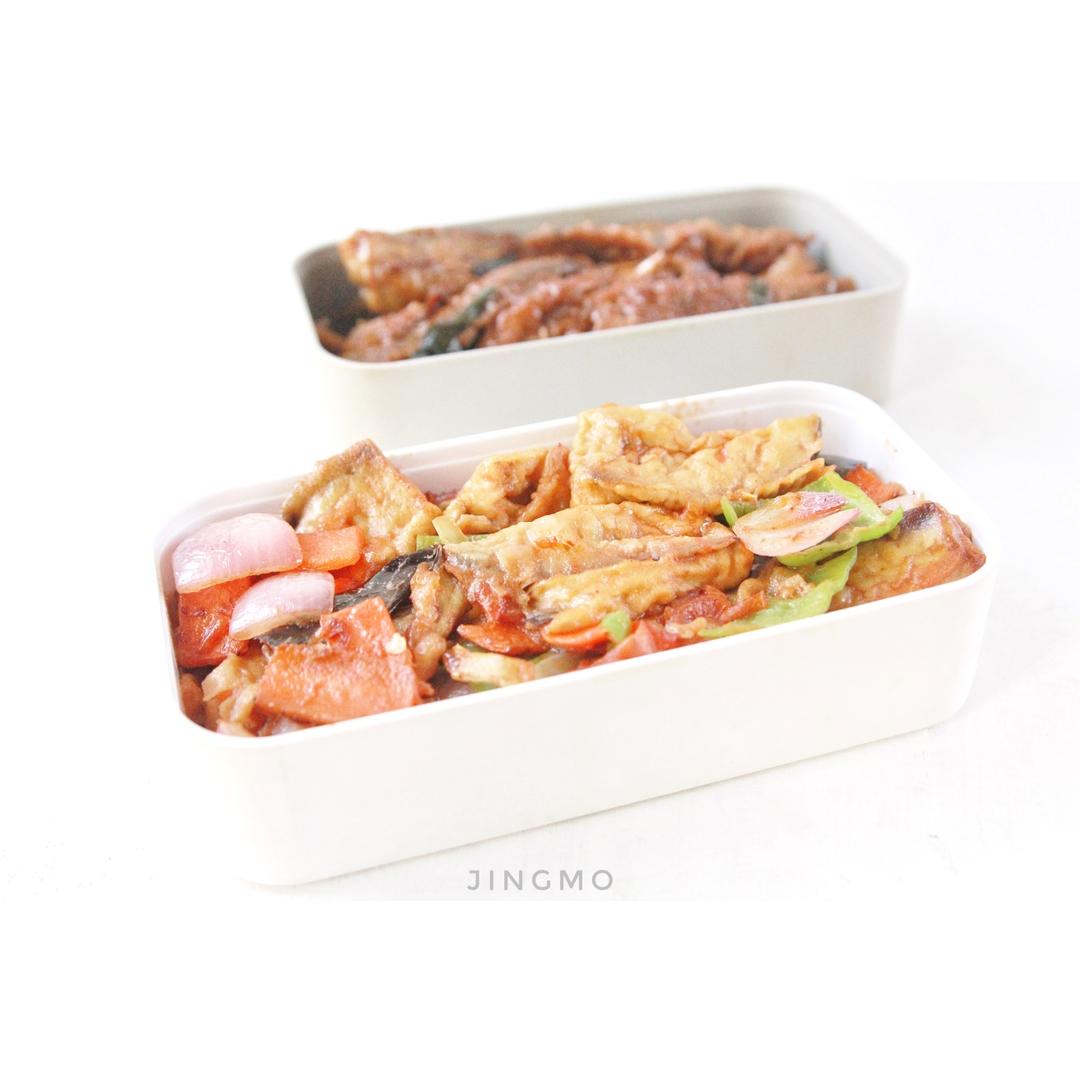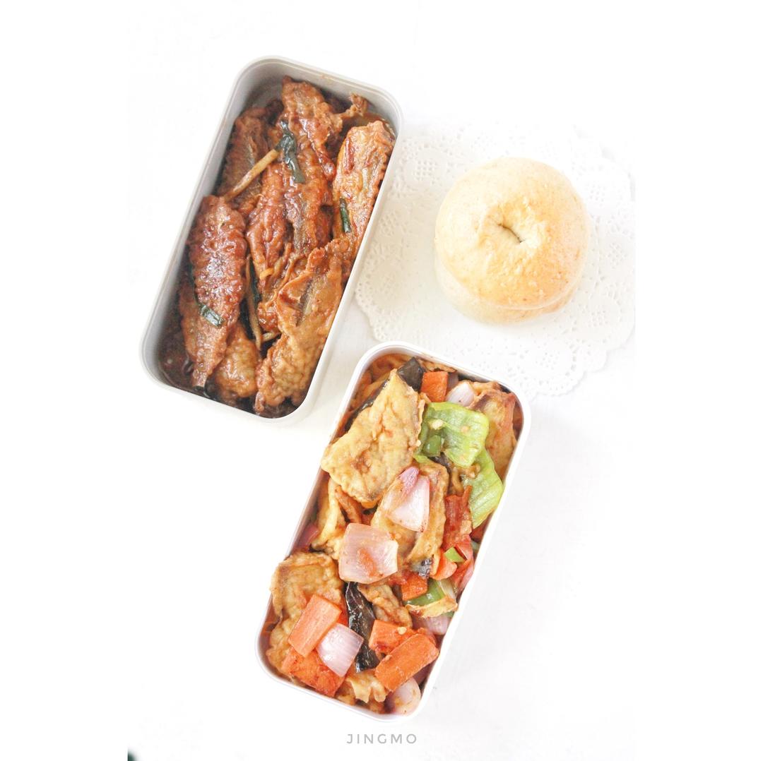 葱烧小黄鱼,烧茄子,贝果。