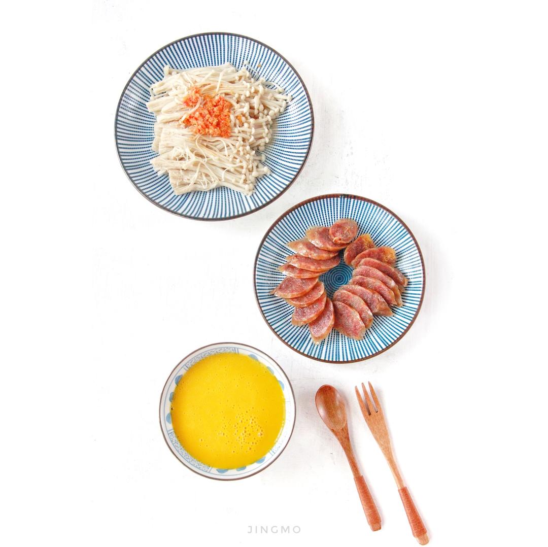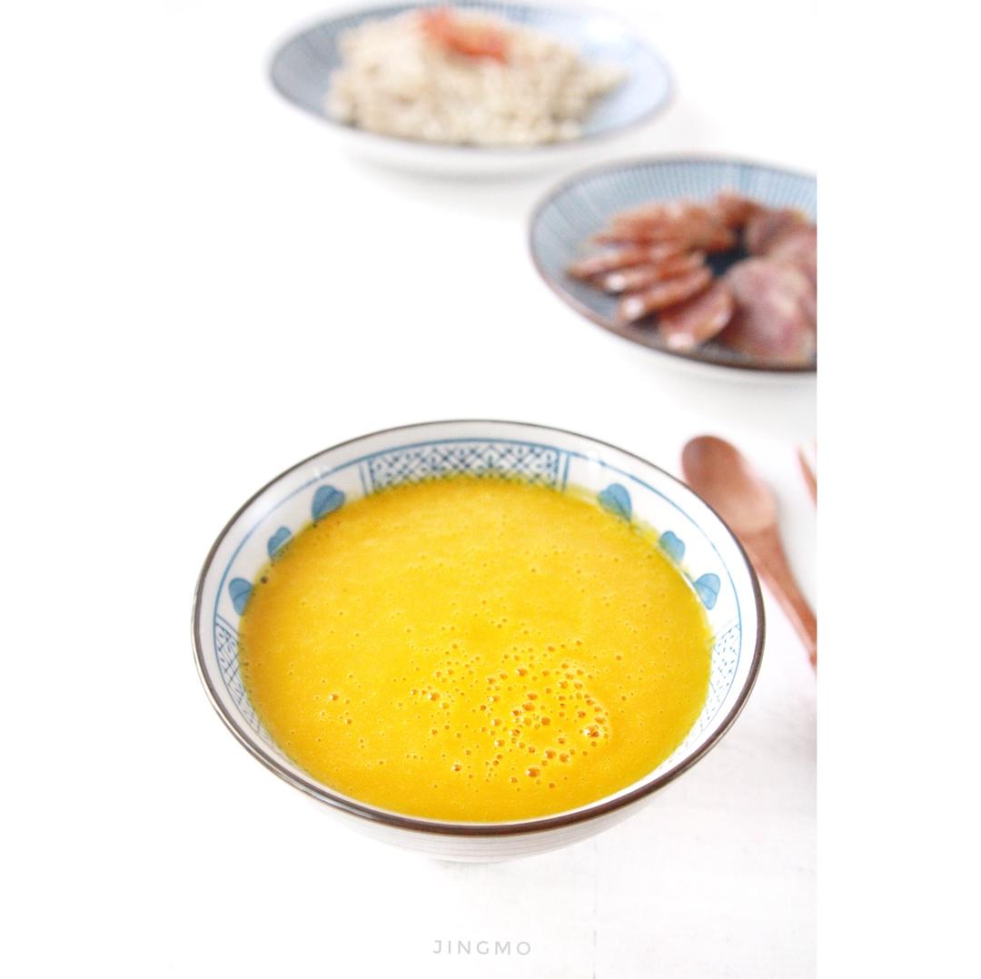南瓜浓汤,蒜蓉辣酱蒸金针菇,蒸腊肠。