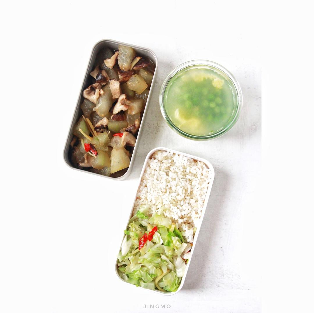 香菇焖冬瓜,清炒卷心菜,糙米饭,豌豆蛋花汤。