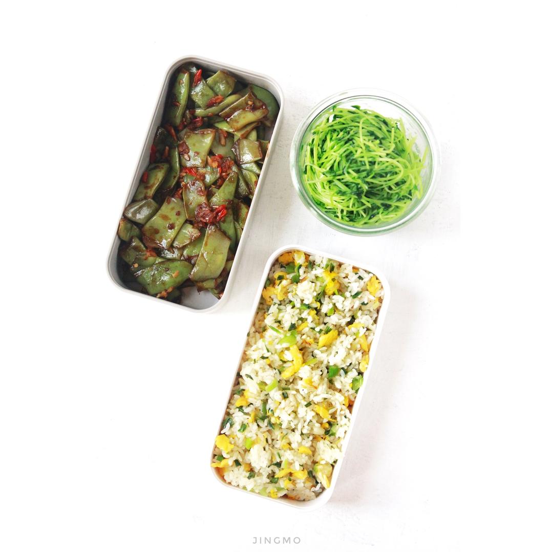 葱多多的蛋炒饭,烧豆角,清炒豌豆苗,甜瓜。